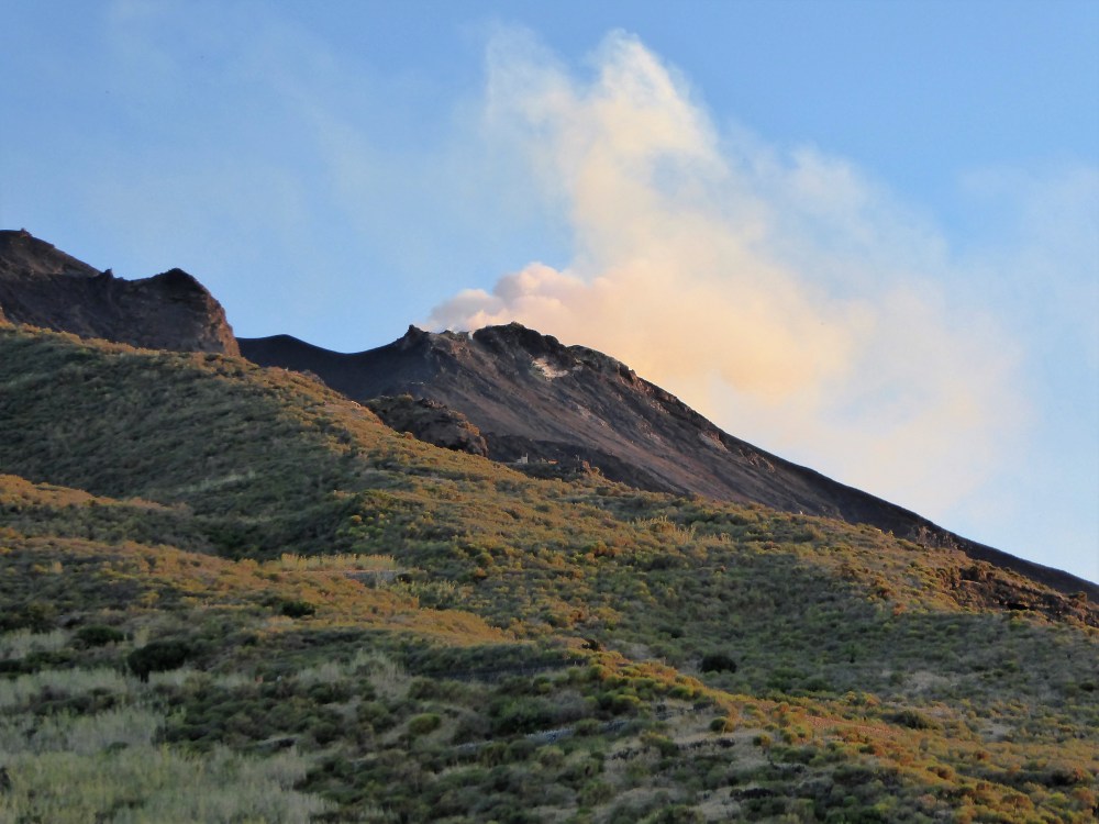 Zu Fuß laufen wir bei Sonnenuntergang auf wilden Wegen bergan zu einem Ristorante, dem „Osservatorio“, von dem aus man spektakulär die Eruptionen aus dem Krater bewundern kann.